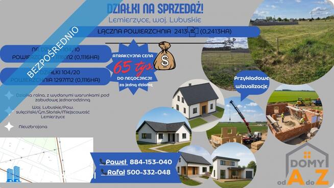 Oferujemy 2 działki o łącznej powierzchni 2 413 m² (0,2413 ha) w spokojnej i zielonej okolicy Lemierzyce, gmina Słońsk, ...